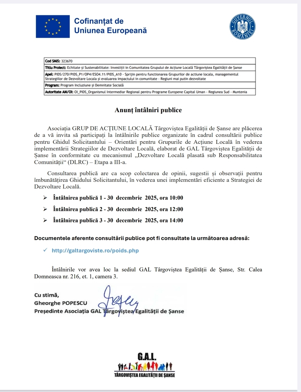 ANUNȚ – Asociația GAL „Târgoviștea Egalității de Șanse”