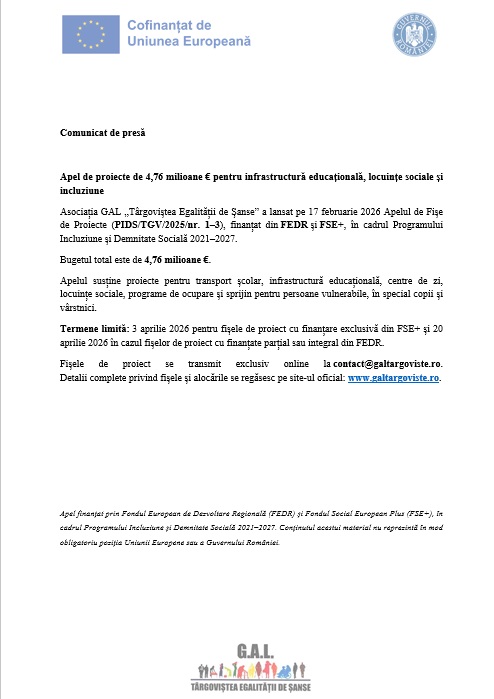 Asociația GAL „Târgoviștea Egalității de Șanse” a lansat pe 17 februarie 2026 Apelul de Fișe de Proiecte (PIDS/TGV/2025/nr. 1–3), finanțat din FEDR și FSE+, în cadrul Programului Incluziune și Demnitate Socială 2021–2027.