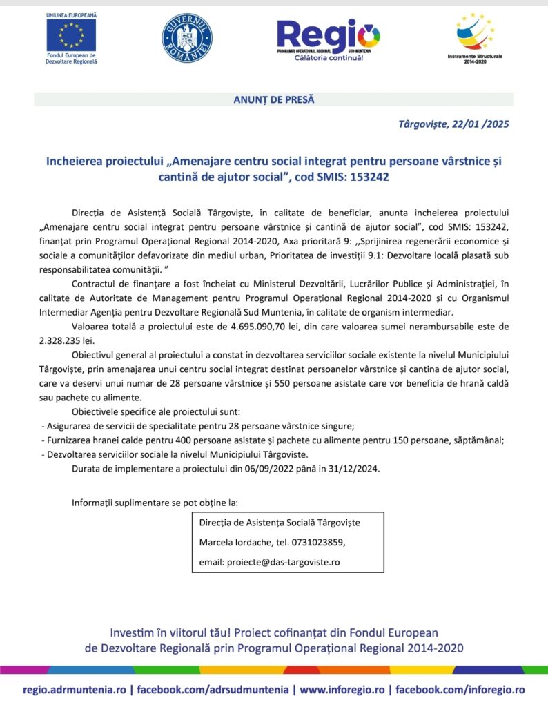 Direcția de Asistență Socială Târgoviște, în calitate de beneficiar, anunta incheierea proiectului „Amenajare centru social integrat pentru persoane vârstnice și cantină de ajutor social”, cod SMIS: 153242, finanțat prin Programul Operațional Regional 2014-2020, Axa prioritară 9: ,,Sprijinirea regenerării economice şi sociale a comunităţilor defavorizate din mediul urban, Prioritatea de investiții 9.1: Dezvoltare locală plasată sub responsabilitatea comunităţii. ”