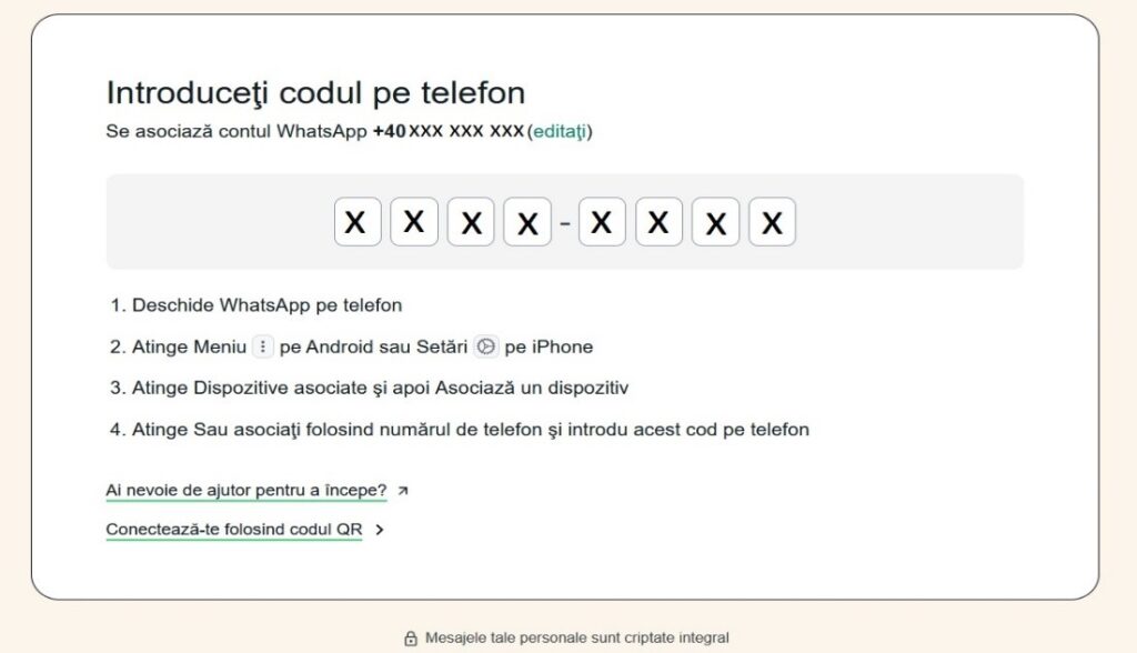 Astfel, folosind acea opțiune, autorii introduc o solicitare de asociere pe alte dispozitive a contului aferent aplicației de mesagerie al potențialei victime, prin introducerea numărului de telefon al acesteia.