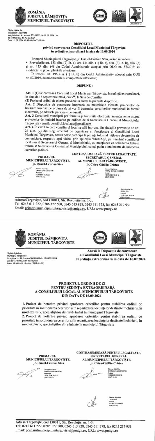 Consiliul Local Municipal Târgoviște se va întruni, luni – 16 septembrie 2024, în ședință extraordinară de lucru de la ora 09:00, având înscrise pe ordinea de zi următoarele proiecte de hotărâre: