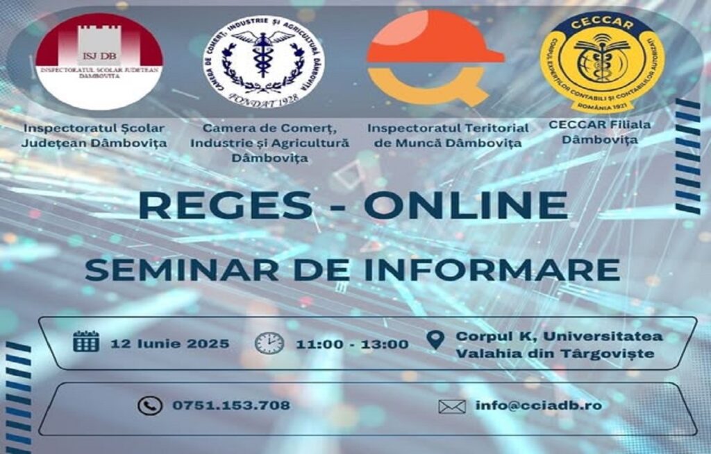 Inspectoratul Teritorial de Muncă Dâmbovița, în colaborare cu Camera de Comerț, Industrie și Agricultură Dâmbovița, Inspectoratul Școlar Județean și CECCAR – Filiala Dâmbovița, organizează un important seminar de informare privind platforma REGES–ONLINE, dedicat angajatorilor și profesioniștilor în resurse umane.