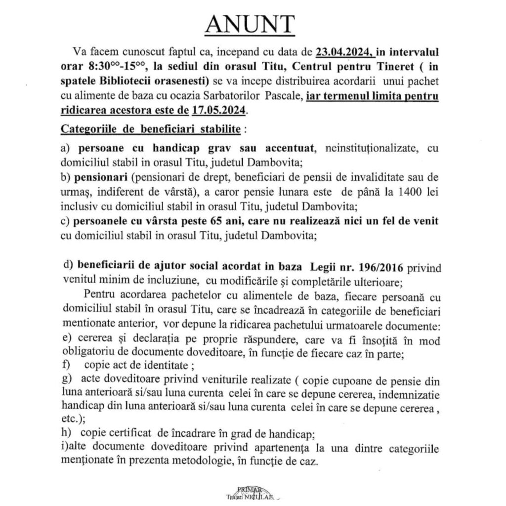Pentru acordarea pachetelor cu alimentele de bază, fiecare persoană cu domiciliul stabil în orașul Titu, care se încadrează în categoriile de beneficiari menționate anterior, vor depune la ridicarea pachetului următoarele documente: