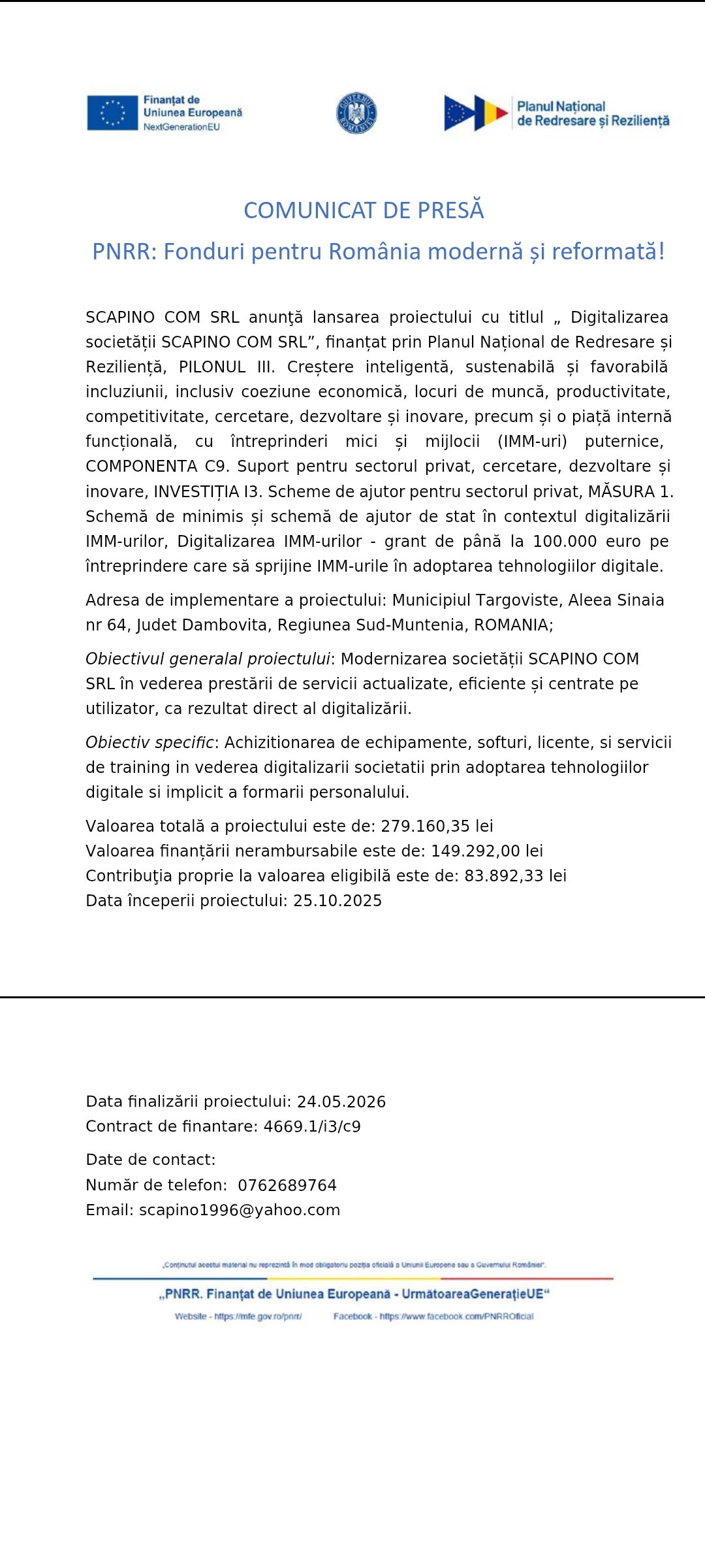 SCAPINO COM SRL anunţă lansarea proiectului cu titlul „ Digitalizarea societății SCAPINO COM SRL”, finanțat prin Planul Național de Redresare și Reziliență, PILONUL III. Creștere inteligentă, sustenabilă și favorabilă incluziunii, inclusiv coeziune economică, locuri de muncă, productivitate, competitivitate, cercetare, dezvoltare și inovare, precum și o piață internă funcțională, cu întreprinderi mici și mijlocii (IMM-uri) puternice, COMPONENTA C9. Suport pentru sectorul privat, cercetare, dezvoltare și inovare, INVESTIȚIA I3. Scheme de ajutor pentru sectorul privat, MĂSURA 1. Schemă de minimis și schemă de ajutor de stat în contextul digitalizării IMM-urilor, Digitalizarea IMM-urilor – grant de până la 100.000 euro pe întreprindere care să sprijine IMM-urile în adoptarea tehnologiilor digitale.