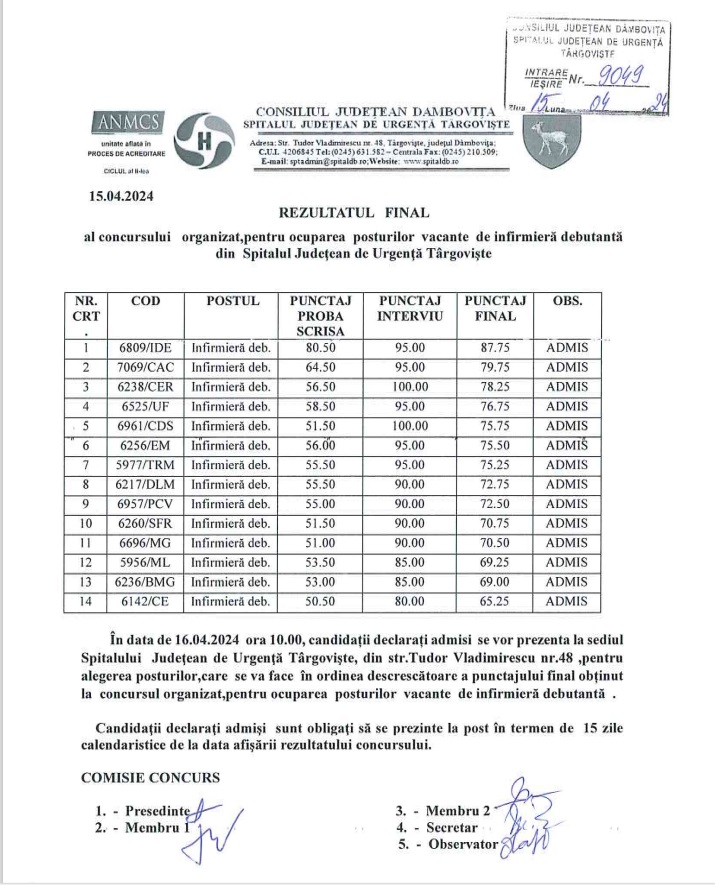 Spitalul Județean de Urgență din Târgoviște a scos la concurs mai multe posturi vacante. De data aceasta, concursul s-a organizat pentru ocuparea unor funcții vacante de infirmieră debutant. Unitatea sanitară a scos la concurs 33 de posturi de infirmieră debutantă, pentru care s-au înscris 93 de participante. Problema lipsei de personal este cunoscută în toate spitalele din România, iar la Târgoviște, așteptarea a luat sfârșit, odată cu organizarea acestui concurs. Anul trecut, măsurile de limitare a angajărilor în sectorul medical public au dus la accentuarea deficitului de personal din spital, fapt care a afectat eficiența activității medicale. Situația se dorea a se redresa după ce se va termina acest concurs.