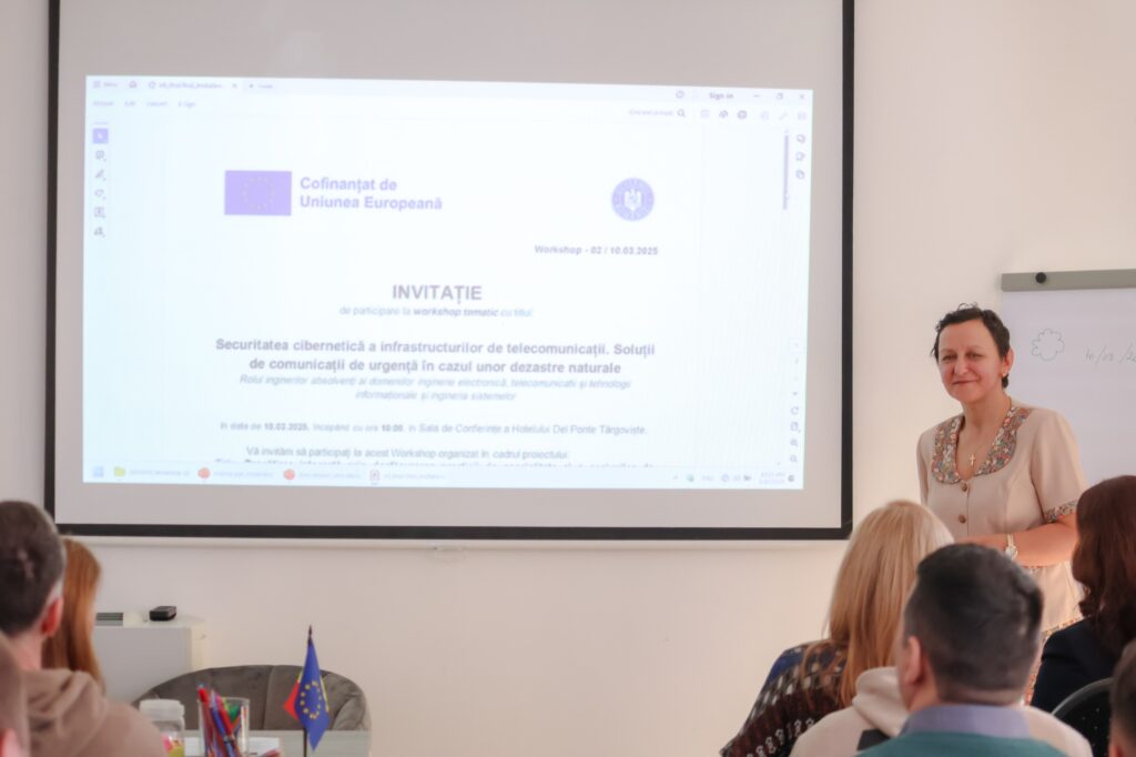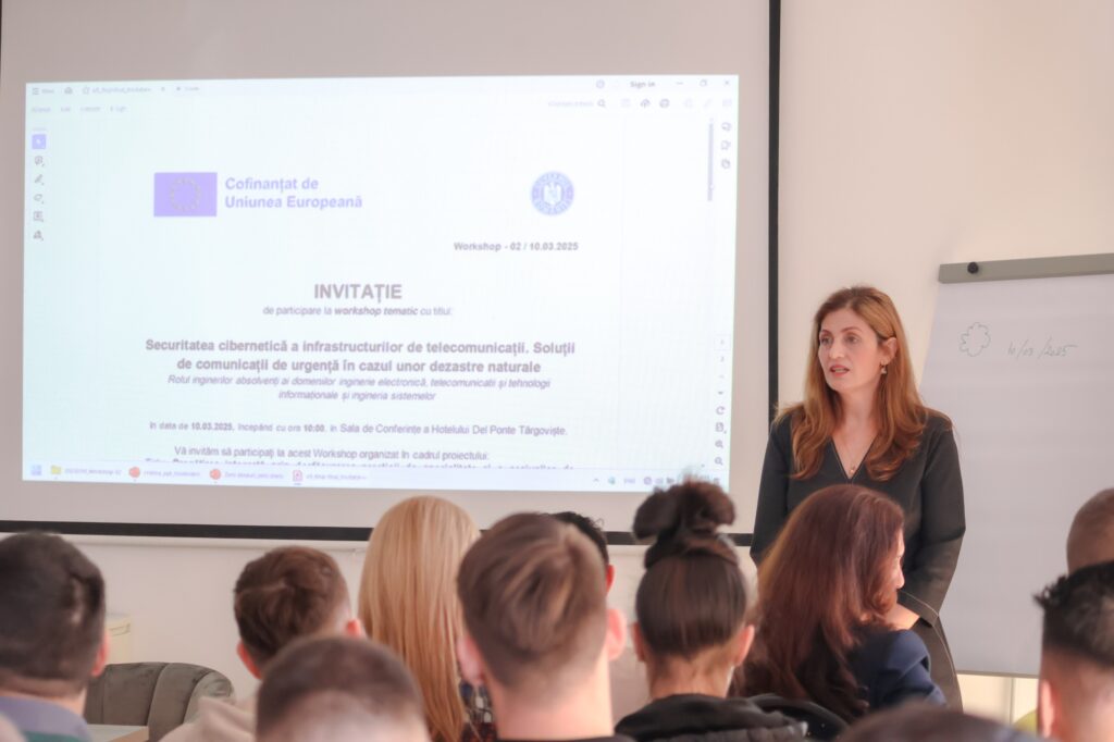 Luni, 10 martie 2025 – Facultatea de Inginerie Electrică, Electronică și Tehnologia Informației (FIEETI) din cadrul Universității „Valahia” din Târgoviște a organizat, în cadrul proiectului „Pregătirea integrată prin desfășurarea practicii de specialitate și a sesiunilor de consiliere avansată pentru studenții Facultății de Inginerie Electrică, Electronică și Tehnologia Informației”cod SMIS 318242, workshopul tematic „Securitatea cibernetică a infrastructurilor de telecomunicații. Soluții de comunicații de urgență în cazul unor dezastre naturale. Rolul inginerilor absolvenți ai domeniilor inginerie electronică, telecomunicații și tehnologii informaționale și ingineria sistemelor”.