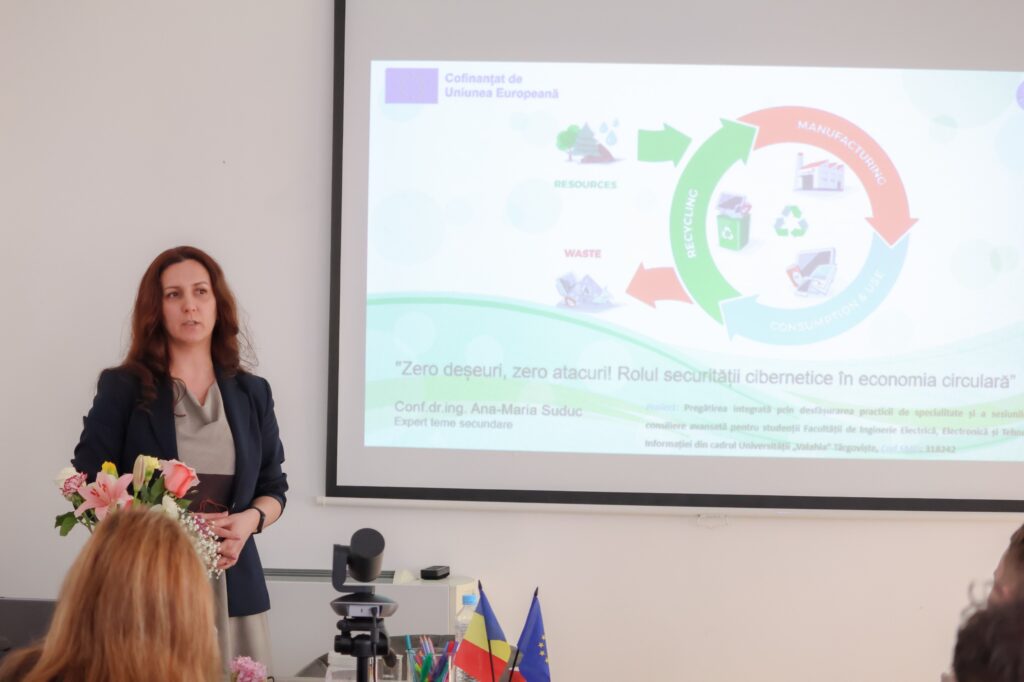 Un moment de impact al evenimentului a fost susținut de conf. dr. ing. Ana-Maria SUDUC, care a abordat subiectul securității cibernetice în economia circulară prin prezentarea „Zero deșeuri, zero atacuri!”. Totodată, Alin BOBEICĂ, reprezentant al Direcției Județene de Telecomunicații Speciale Dâmbovița, a evidențiat rolul acestor servicii în ecosistemul IT&C, precum și provocările securității informației în era transformării digitale.